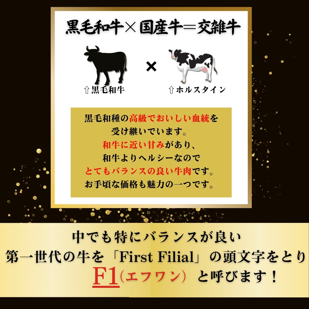 F1牛は、肉質に優れた日本の黒毛和種と、体が大きく成長が早いホルスタイン種を掛け合わせた、良いところを両方受け継いだ牛です。「F1」は、雑種第一代を意味する「First Filial Generation」の略称です。