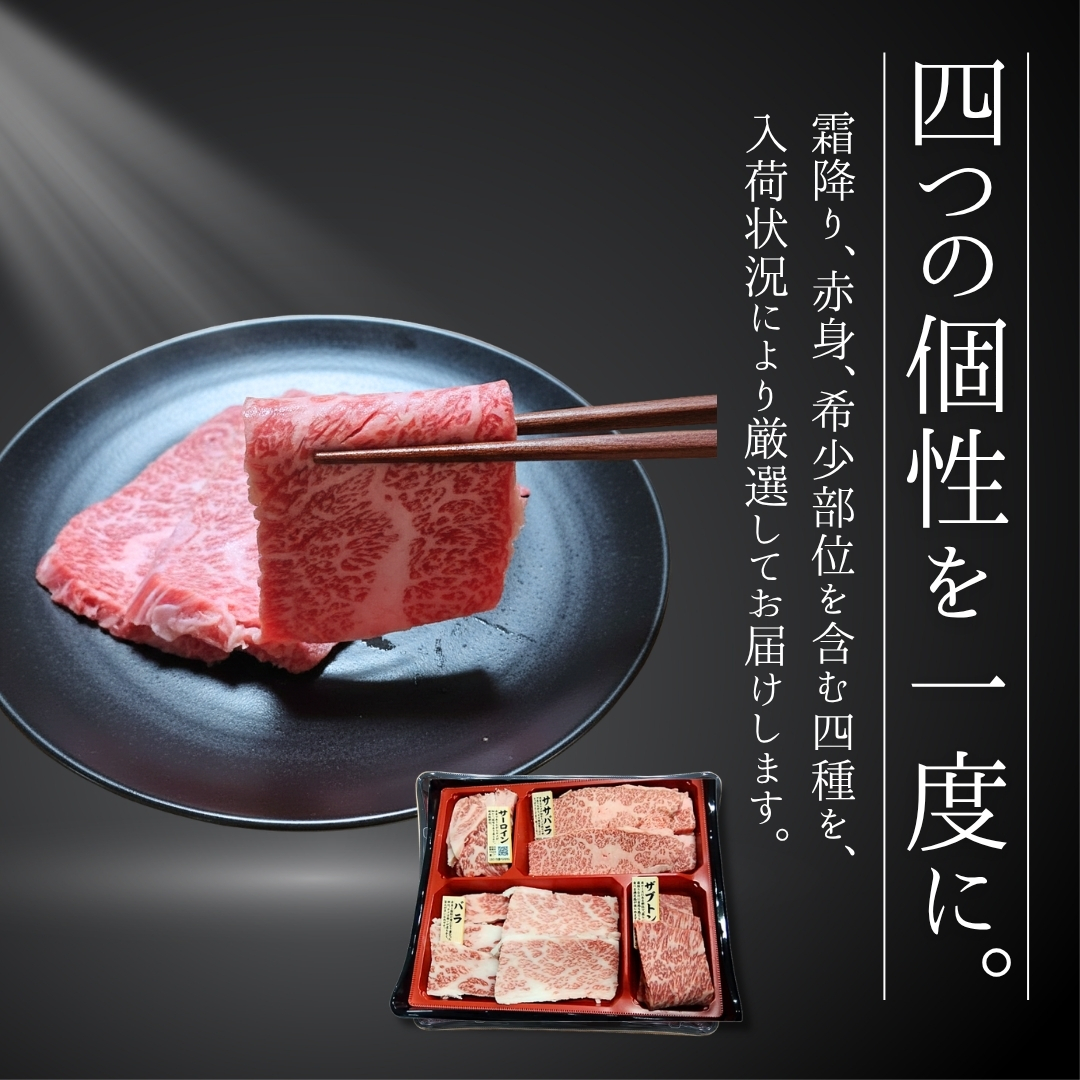 A4・A5ランクの国産黒毛和牛を、部位ごとの旨みを最大限に活かした4種盛りに仕立てました。