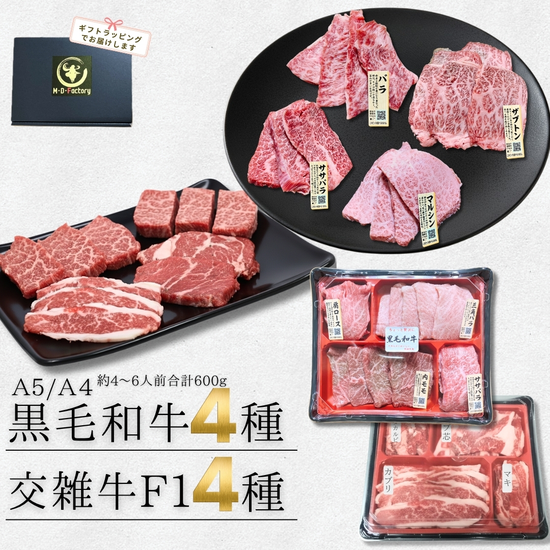 【送料無料】食べ比べ A5A4黒毛和牛4種&F1 交雑牛(和牛×国産牛) 焼肉ギフト約4~6人前 約600g