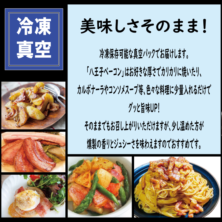 厳選した国産豚肉を使用し、作り上げたその名も「八王子ベーコン」!!みんな大好き八王子ベーコンとは ◎東京都八王子市で作られたベーコン◎丁寧にハーブを擦り込み、昔ながらの乾塩製法で豚肉をじっくり熟成桜チップで薫煙しました◎食肉卸の目利き職人が原料である国産豚を厳選・好きな厚さにカットしてカリカリに焼いたり・カルボナーラやコンソメスープに少量入れるだけでグッと旨味がアップ
