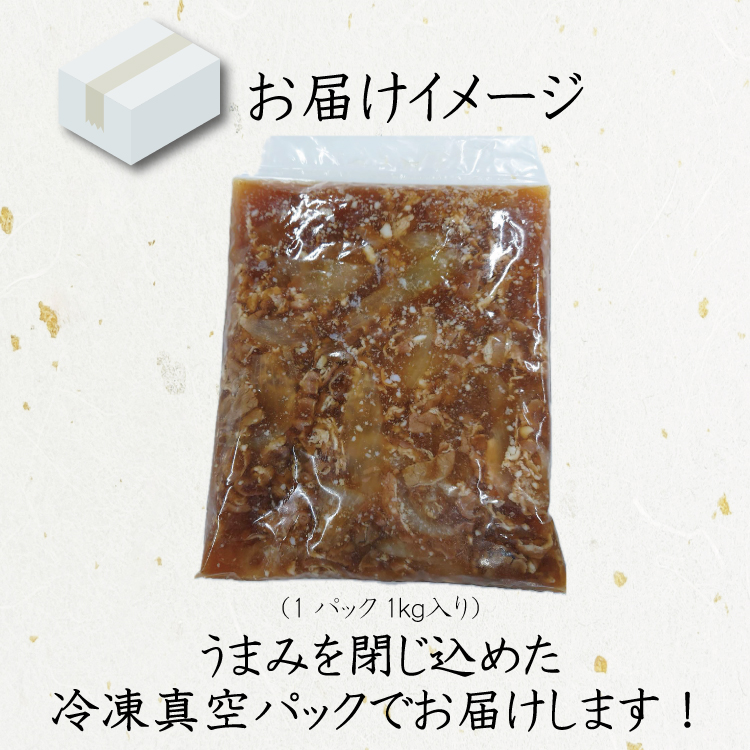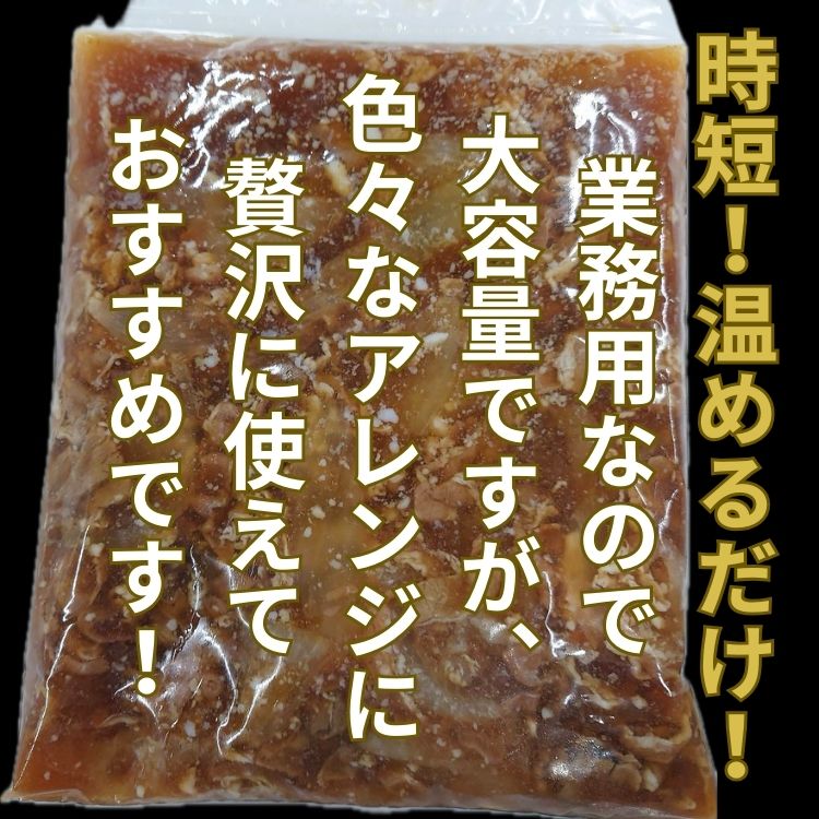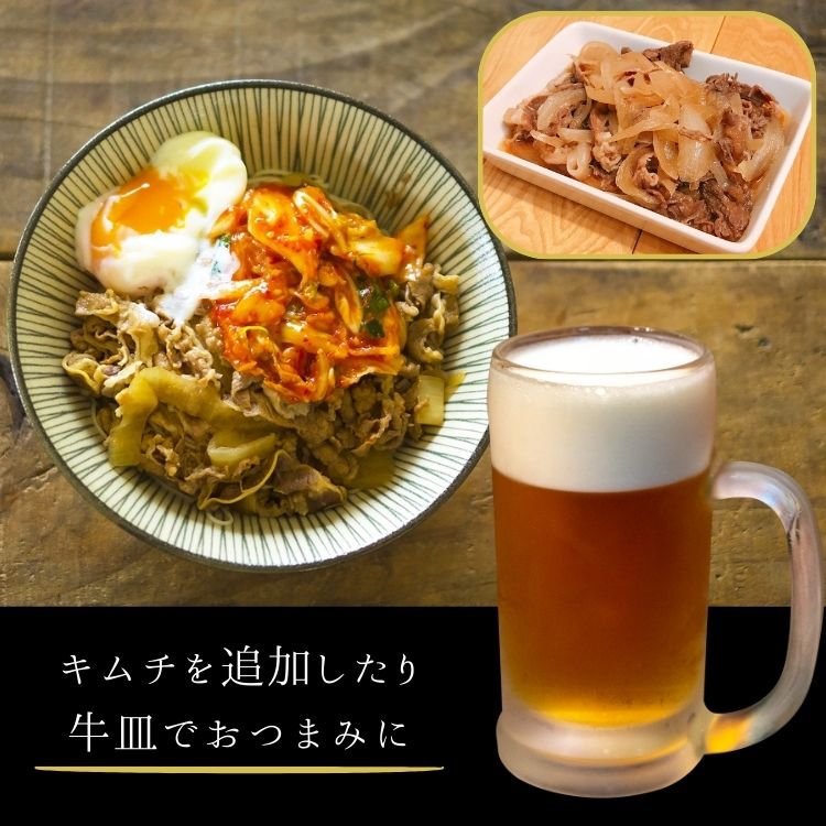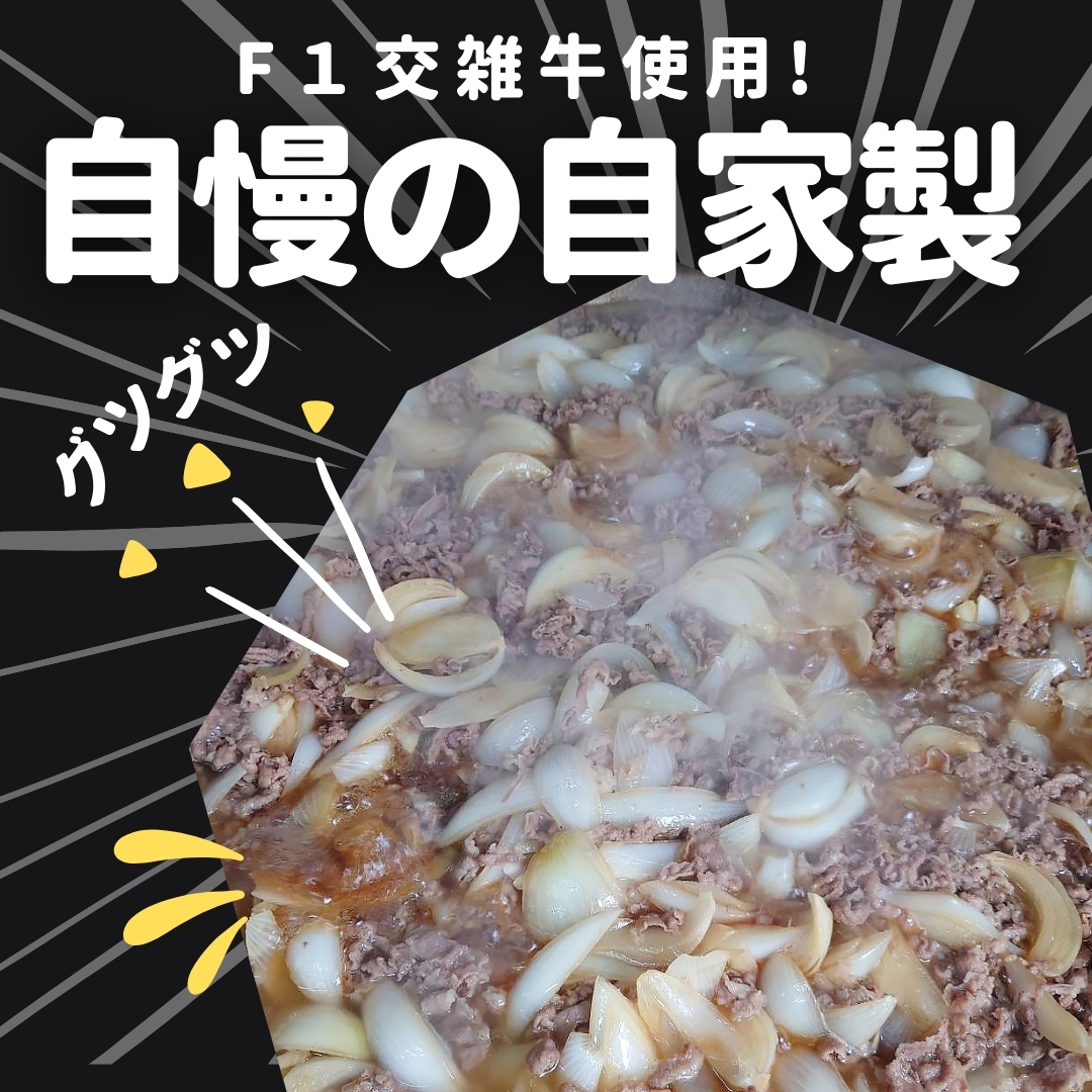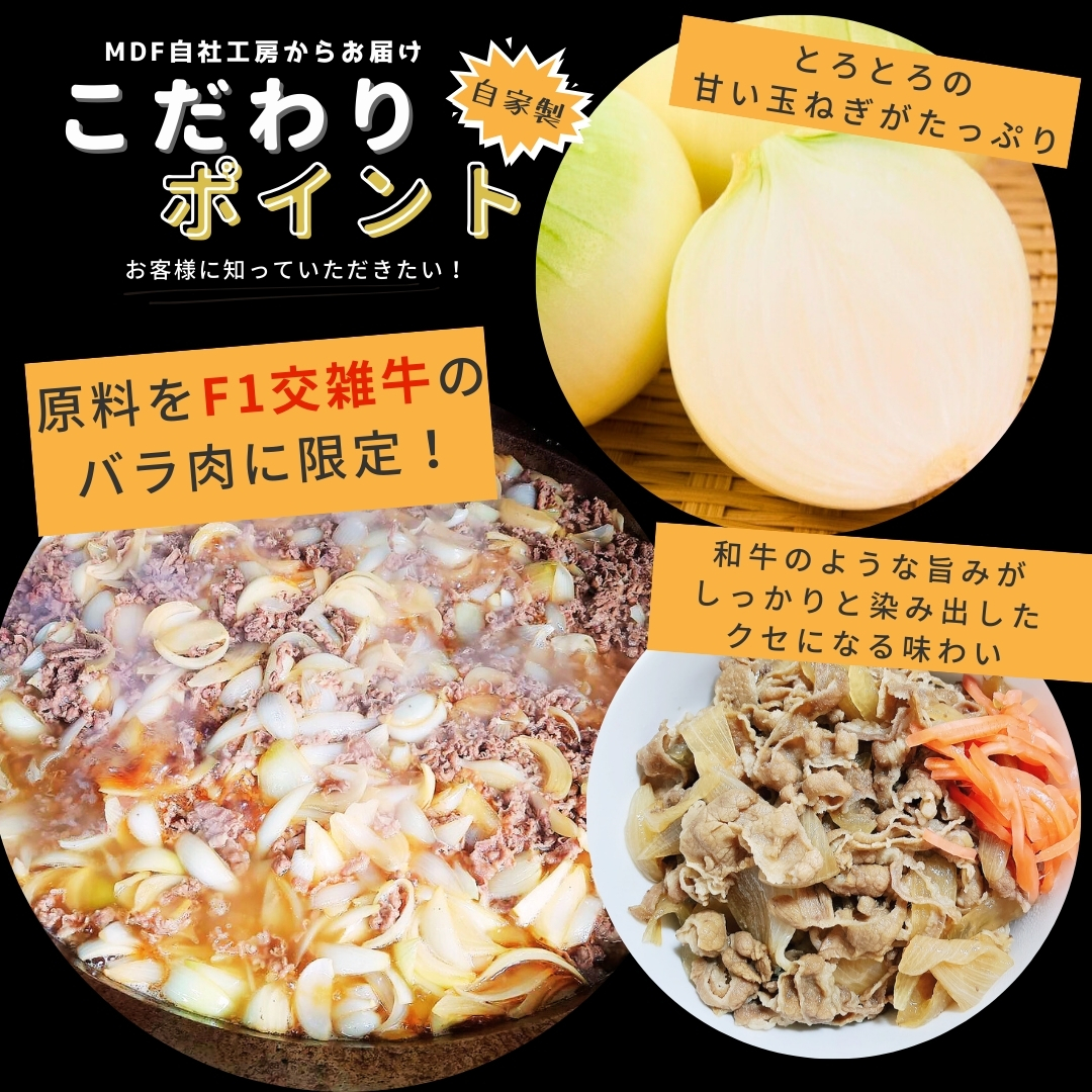 F1牛バラを1.5mmの極薄スライスし、たまねぎと加熱調理しました。黒毛和牛のような旨みがしっかりと染み出した汁がクセになる味わいです。たまねぎの甘味と牛の旨味を堪能できます。冷凍状態の袋のまま、100℃20分ボイル、または解凍後開封し充分に加熱してお召し上がりください。