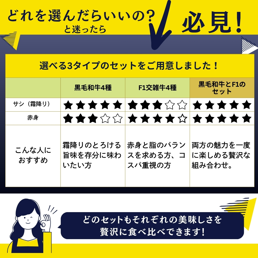 黒毛和牛ならではの深いコクと香りを、一度に食べ比べできる贅沢なセットです。