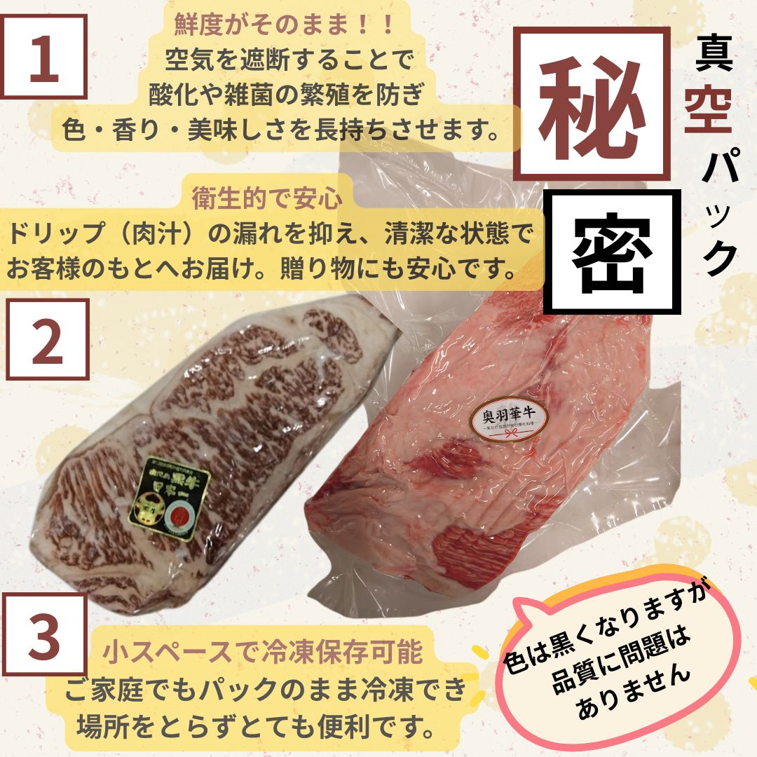 当該商品は、肉本来の風味と鮮度を維持するため、新鮮なうちにパックにて包装、冷凍便でお届けさせていただいております。お肉は空気が抜けることにより、多少黒ずんで見えますが鮮度には全く問題ございません。