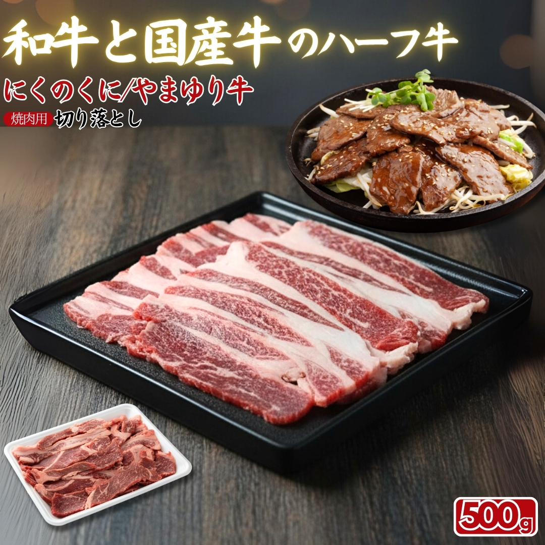\和牛と国産牛のハーフ牛/にくのくに北海道黒牛 or やまゆり牛 カルビ切り落とし 500g 焼肉用 どちらかが届く!